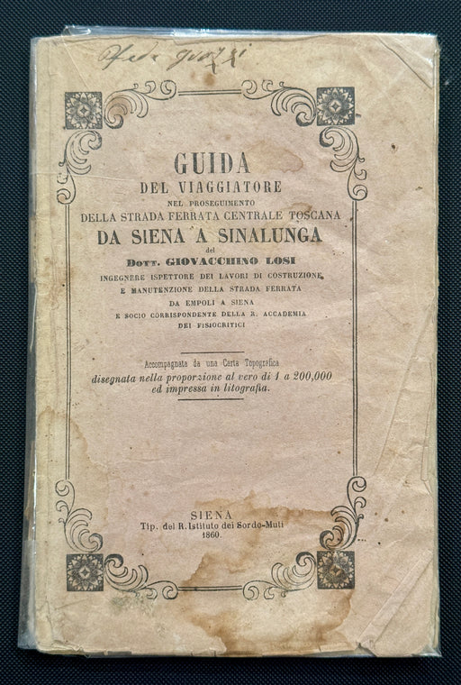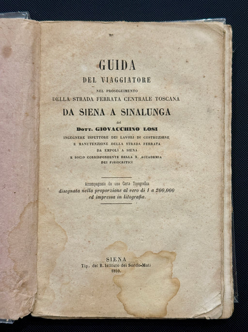 "Guida del viaggiatore Strada Ferrata Siena Sinalunga Giovacchino Losi" libro Tipografia Sordo Muti con carta topografica Siena 1860
