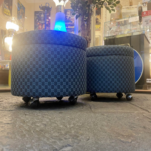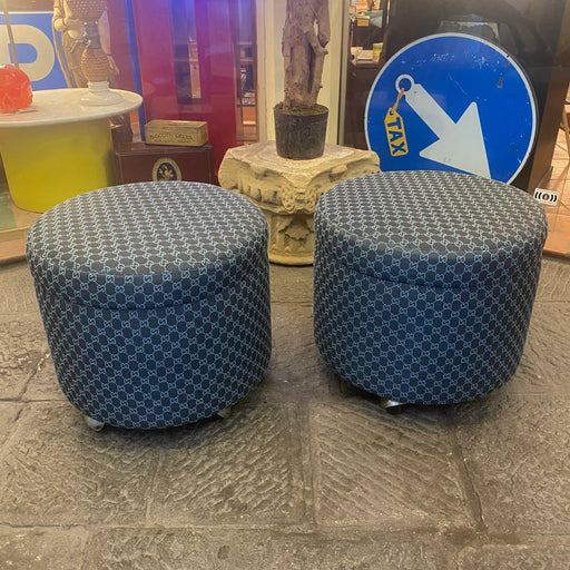 Prezzo originale €500,00 - Prezzo originale €500,00Prezzo originale€500,00€500,00 - €500,00Prezzo attuale €500,00Pouf cilindrici con ruote degli anni settanta, da noi rivestiti con stoffa originale Gucci blu GG jacquard. Pronti per essere messi in casa, non n...