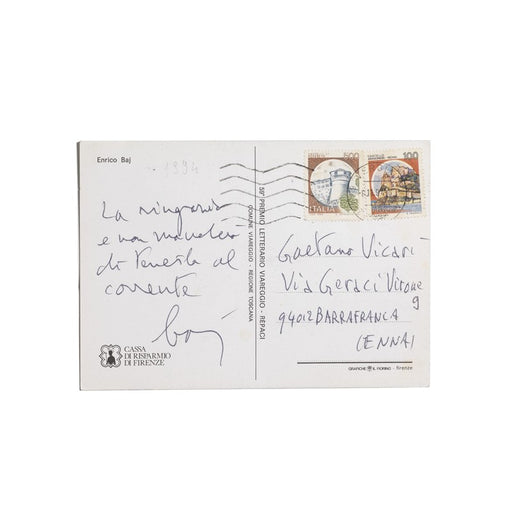 Prezzo originale €150,00 - Prezzo originale €150,00Prezzo originale€150,00€150,00 - €150,00Prezzo attuale €150,00| /Cartolina originale del 50esimo Premio Letterario Viareggio - Repaci illustrata dal Maestro Enrico Baj, firmata e spedita dallo stesso con dedica.