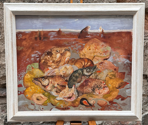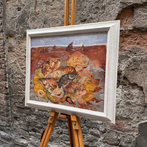 Prezzo originale €2.100,00 - Prezzo originale €2.100,00Prezzo originale€2.100,00€2.100,00 - €2.100,00Prezzo attuale €2.100,00| /Opera unica del Maestro Antonio Possenti, olio su cartone rigido raffigurante pesci sulla spiaggia. Cornice da noi applicata.