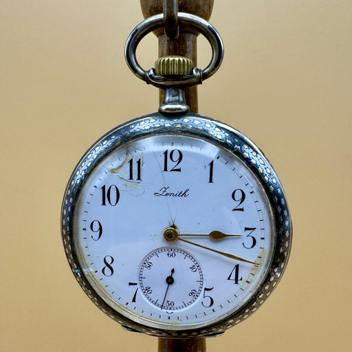 Orologio da tasca Zenith 1900, funzionante, Difetto nel quadrante ad ore 11 visibile in foto. Cassa in argento 800 brunito lavorato.