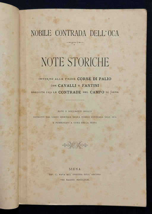 • "Note storiche intorno alle prime corse di Palio" libretto Nobile Contrada dell' Oca Siena 1892
