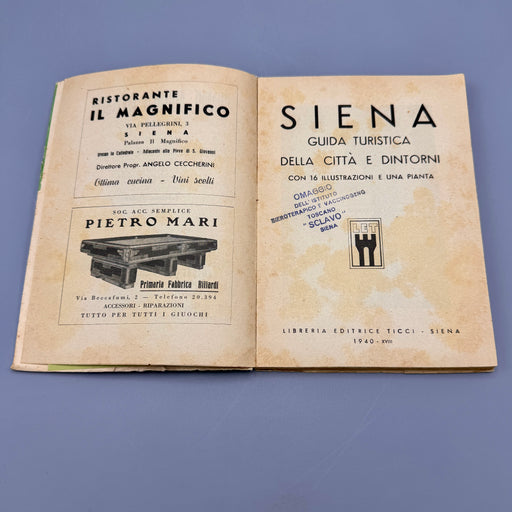 Prezzo originale €0,00 - Prezzo originale €0,00Prezzo originale€0,00€0,00 - €0,00Prezzo attuale €0,00| /Libro "Siena Guida Turistica" del 1940 omaggio della Sclavo, con inserto pubblicitario dell'azienda farmaceutica. Completo di mappa.