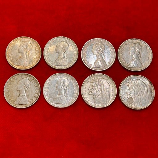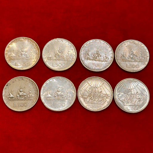 Prezzo originale €0,00 - Prezzo originale €0,00Prezzo originale€0,00€0,00 - €0,00Prezzo attuale €0,00| /Lotto di 8 monete d'argento 500 lire, 6 caravelle e 2 dante, varie annate.