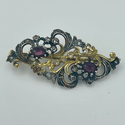 Prezzo originale €0,00 - Prezzo originale €0,00Prezzo originale€0,00€0,00 - €0,00Prezzo attuale €0,00| /Spilla in argento 925 dorato e brunito motivi florali con pietre.