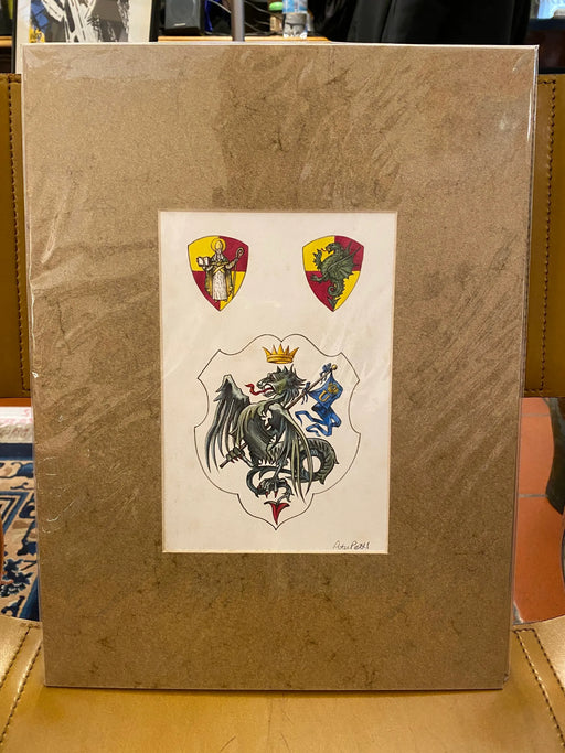 Prezzo originale €0,00 - Prezzo originale €0,00Prezzo originale€0,00€0,00 - €0,00Prezzo attuale €0,00| /Bozzetto preparatorio raffigurante lo stemma e compagnie militari della Contrada del Drago per il libro “Stemmario Senese” edito dalla Betti editri...