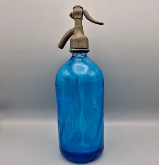 Prezzo originale €0,00 - Prezzo originale €0,00Prezzo originale€0,00€0,00 - €0,00Prezzo attuale €0,00| /Bottiglia da Seltz soda marca Giovanni Bagli Riccione, vetro blu serigrafato e tappo personalizzato. Non testato.