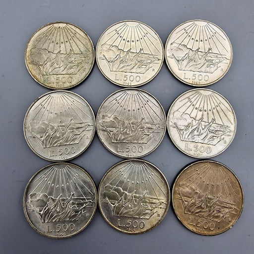 Prezzo originale €0,00 - Prezzo originale €0,00Prezzo originale€0,00€0,00 - €0,00Prezzo attuale €0,00| /Lotto di 12 monete da 500 lire argento come da foto, varie tipologie, due San Marino. Non ripulite, come da ritrovamento.
