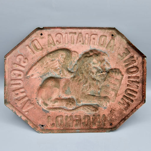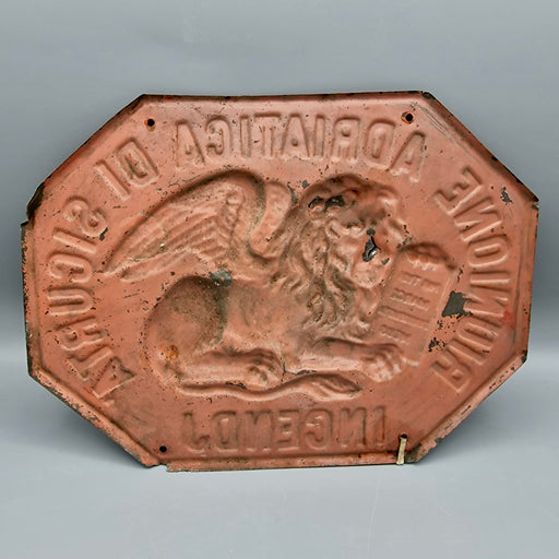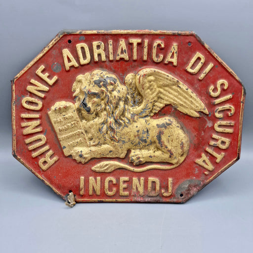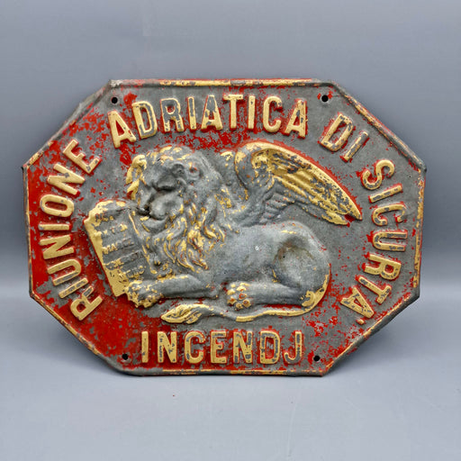 Insegna Riunione Adriatica di sicurità Incendj latta litografata fustellata Italia 1910 ca
