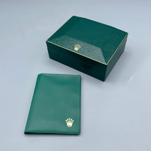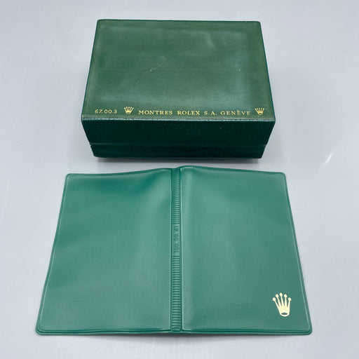 Prezzo originale €0,00 - Prezzo originale €0,00Prezzo originale€0,00€0,00 - €0,00Prezzo attuale €0,00| /Originale scatola Rolex per orologio (Oyster) referenza 67.00.3, colore verde forma trapezio. Con portadocumenti Rolex coevo, ref. 100.00.41