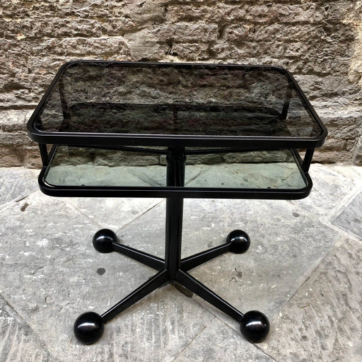 Prezzo originale €0,00 - Prezzo originale €0,00Prezzo originale€0,00€0,00 - €0,00Prezzo attuale €0,00| /Tavolino di design carrello con ruote realizzato dalla ditta Allegri di Parma, anni settanta. Doppio piano, vetro superiore serigrafato Allegri.