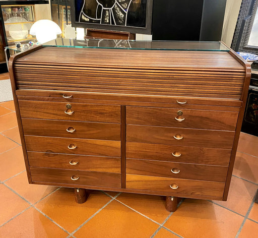 Prezzo originale €0,00 - Prezzo originale €0,00Prezzo originale€0,00€0,00 - €0,00Prezzo attuale €0,00| /Scrivania a rullo modello “804” in legno impiallacciato in noce disegnato da Gianfranco Frattini per Bernini. Piano superiore in vetro trasparente...