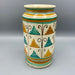 Albarello lombardo in ceramica con decori verdi ed arancioni geometrici.