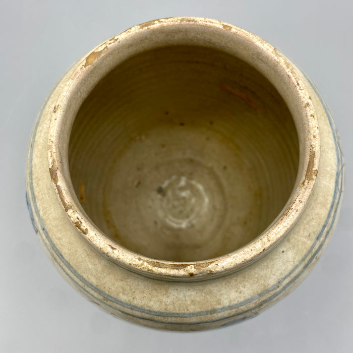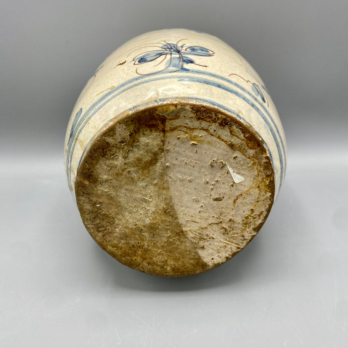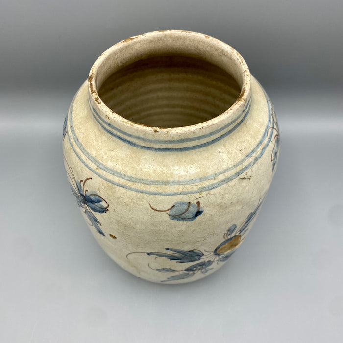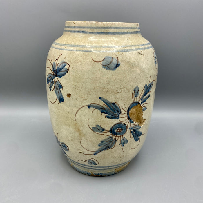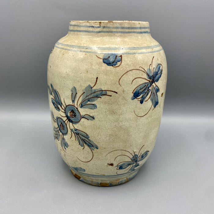 Albarello maiolica con decoro floreale azzurro realizzato a San Quirico d'Orcia. Non presenta restauri, conservato.