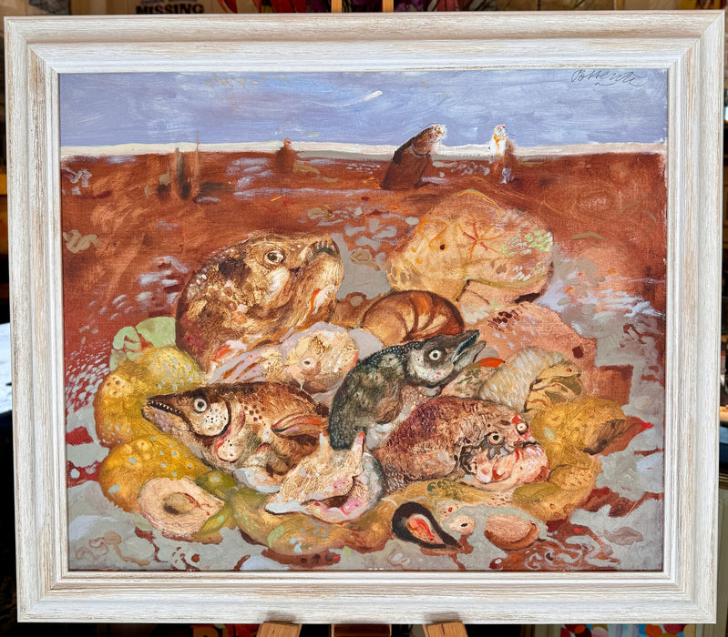 Opera unica del Maestro Antonio Possenti, olio su cartone rigido raffigurante pesci sulla spiaggia. Cornice da noi applicata.
