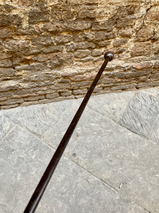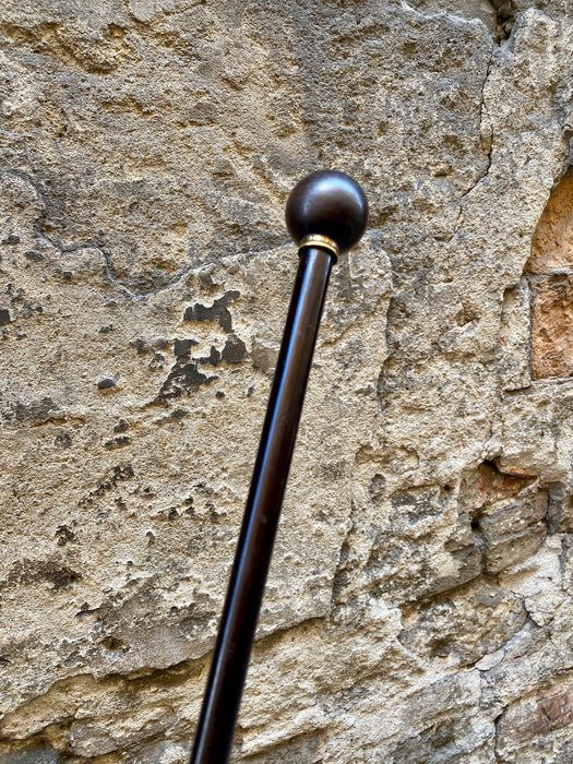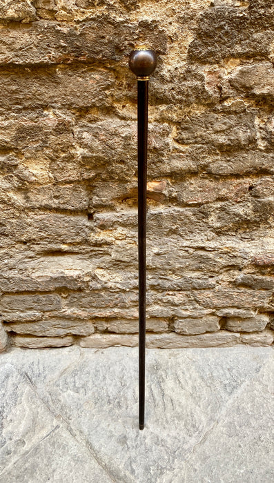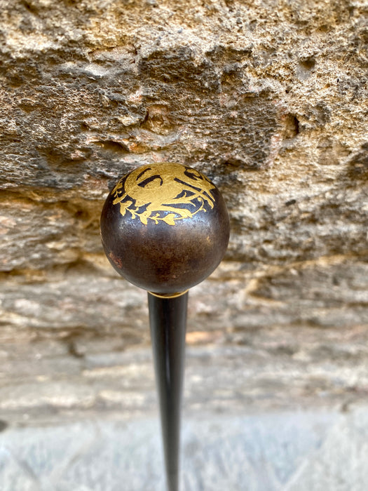 Bastone da passeggio, realizzato in ebano. Sul pomello, ageminato in oro, figure di flora e fauna. Realizzato a Toledo, in Spagna.