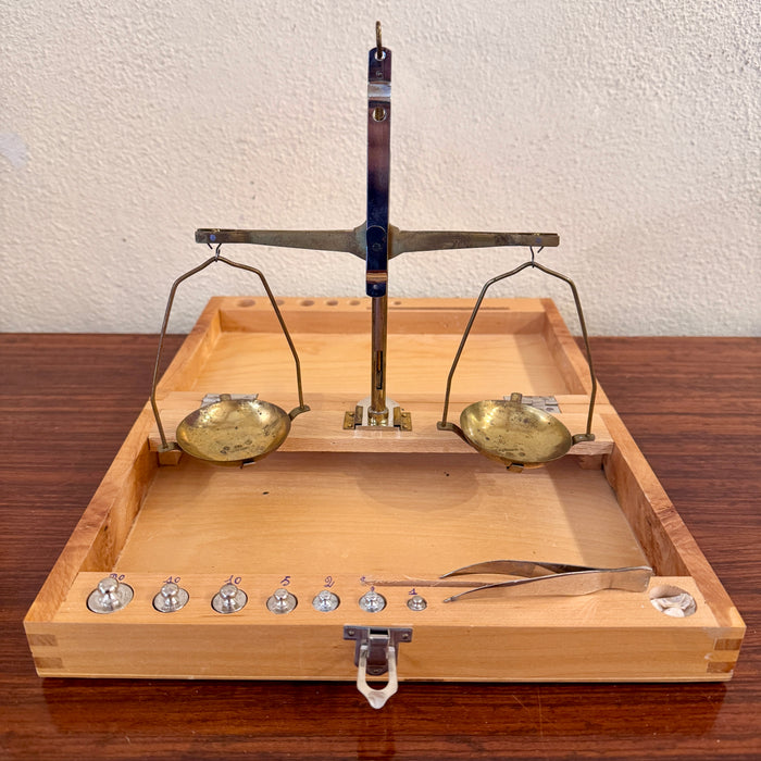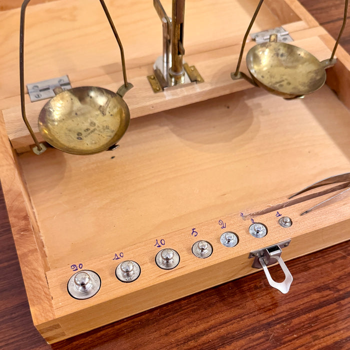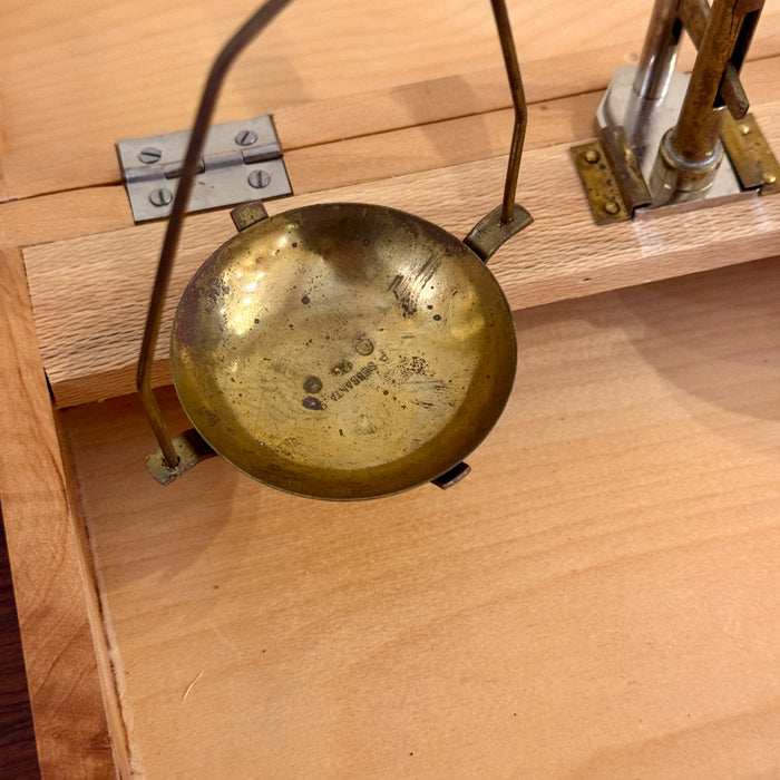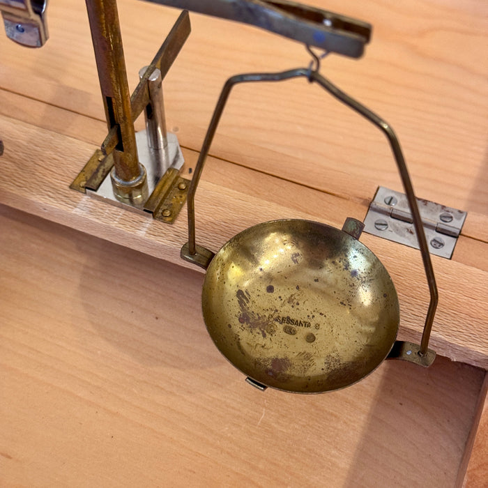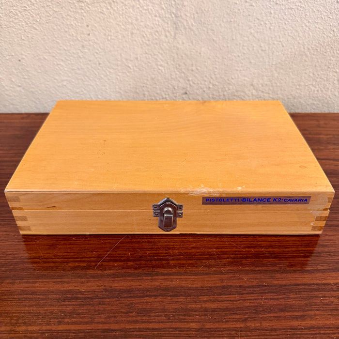 Vecchia bilancia in ottone per misurazioni di precisione, realizzata in ottone. Comprensiva di pesi anch'essi in ottone, pinze e scatola in legno. Etichetta esterna riporta la scritta "Pistoletti bilance K2 Cavaria".