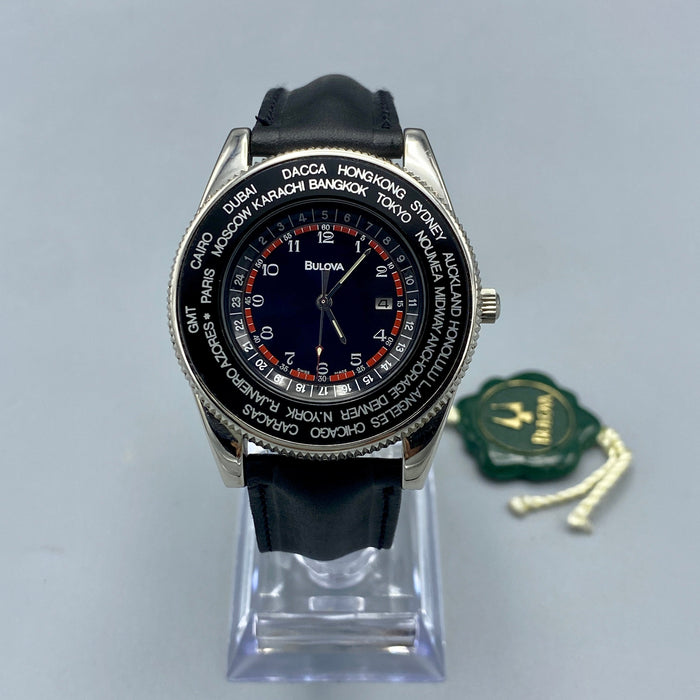 Orologio da polso Bulova modello Timemaster Gmt Worldtimer referenza 13021 NOS mai indossato. Movimento al quarzo, cinturino in pelle marchiato Bulova originale, con il passare degli anni la parte inferiore inizia a sbriciolarsi, la sostituzione dello stesso è a carico e gusto del cliente.
