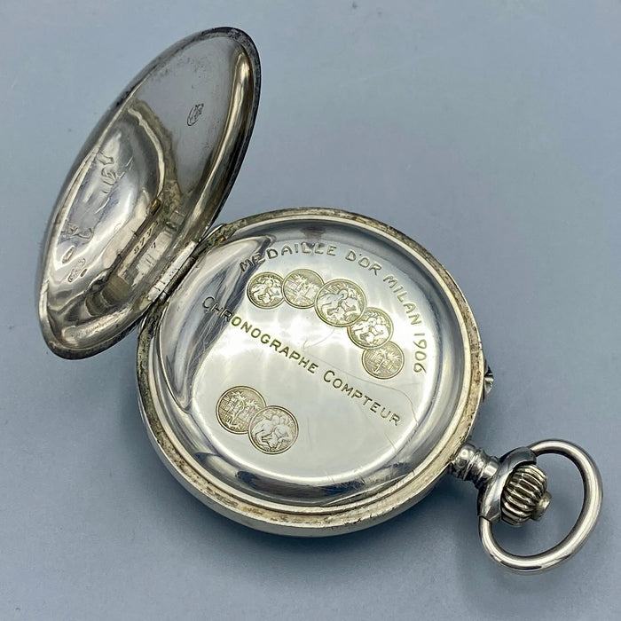 Orologio da tasca in argento 800 con cronometro, complicazione Chronographe Compteur premiata con la medaglia d’oro alla Fiera di Milano del 1906. Funzionante, revisionato.