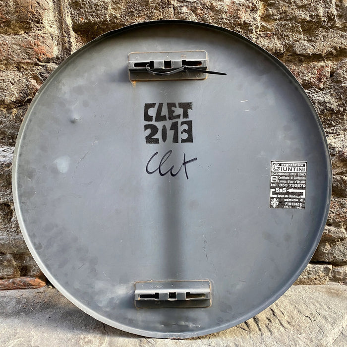 Originale cartello realizzato da Clet Abraham nel 2013. La freccia di obbligo di corsia, grazie all’intervento dell’artista, diventa un indicatore finanziario rivolto verso il basso, ad indicare la riduzione delle tasse grazie al cartellino aggiunto in alto. Firmato sul fronte e sul retro.
