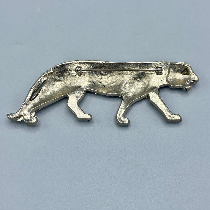 Spilla pantera in metallo argentato e strass Italia 1980 ca
