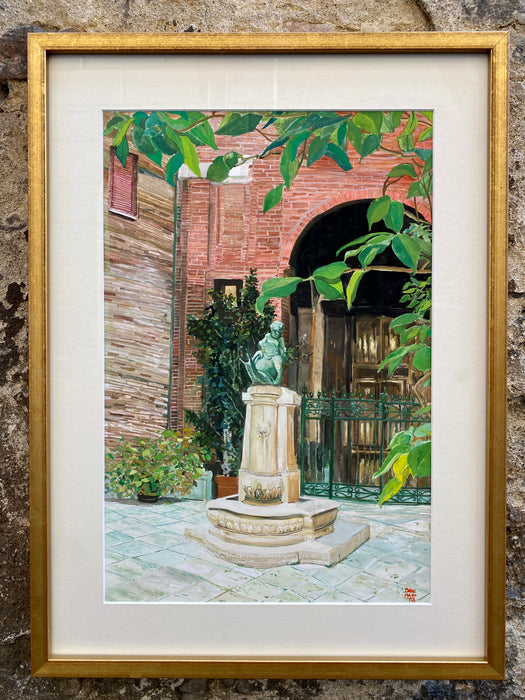 Opera unica del Maestro Daniele Marotta, raffigurante fontanina di Contrada. Tempera su carta, cornice oro e vetro zeroglass antiriflesso. Opera facente parte del ciclo pittorico "Fontanine di Contrada" esposte nella mostra del Chiostro di San Cristoforo a Siena nel Dicembre 2022. Catalogo della mostra in omaggio in accompagnamento all'opera.