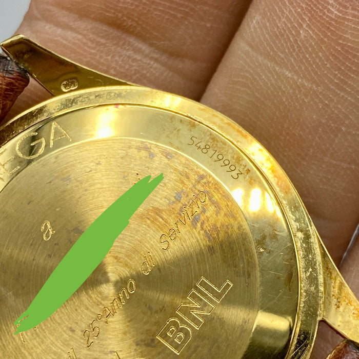 Orologio da polso in oro 18kt marca Omega, modello Classic Heritage movimento ETA 2892-2A Omega 1108. Funzionante, completo di sua scatola, no documenti. Fondello personalizzato con nome della persona che ricevette l'orologio come presente per i 25 anni di lavoro in banca.