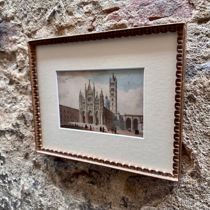 Incisione ottocentesca, acquarellata in epoca, raffigurante il Duomo di Siena. Opera in cornice come da ritrovamento, passpartout nuovo.