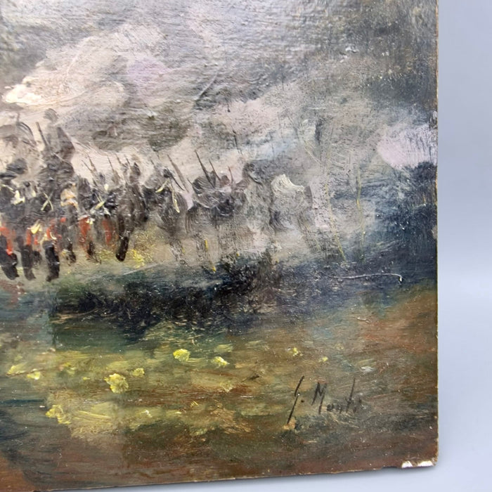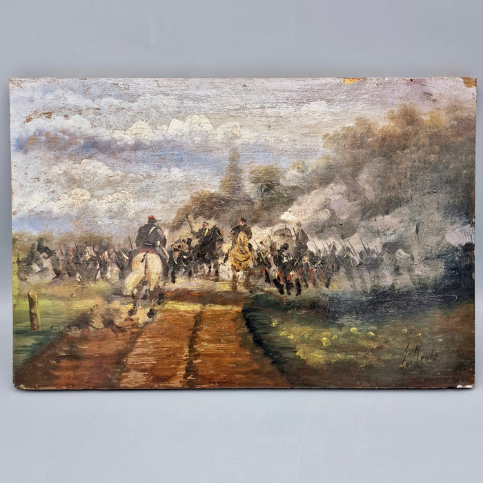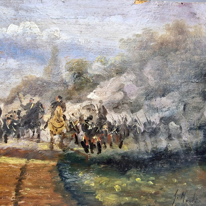 Olio su tavola dell’artista G. Monti, raffigurante battaglia di cavalleria. Opera senza cornice.