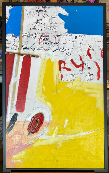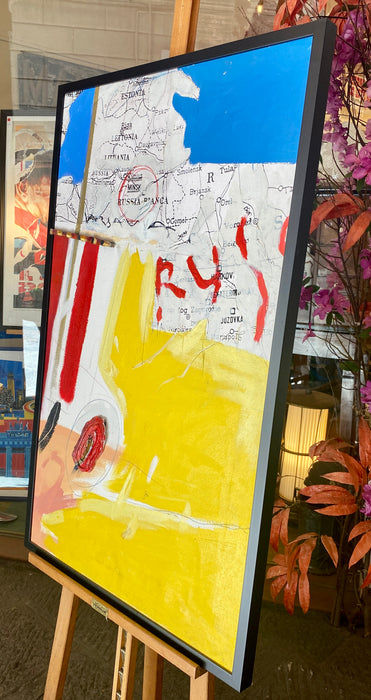 Opera unica del Maestro Gianni Dorigo, ciclo pittorico con sfondi geografici. Olio e collage su tela. Opera da noi rifinita in semplice cornice nera a filo del telaio.
