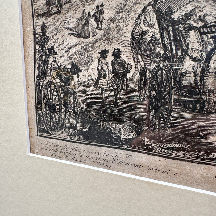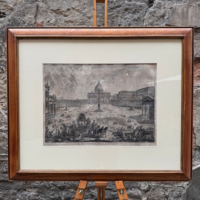 Incisione su carta disegnata dal celebre Giovanni Battista Piranesi "Veduta della Basilica e Piazza San Pietro in Vaticano". Opera tra le più celebri e ricercate del Maestro, in cornice come da ritrovamento. Restauro nella parte centrale sinistra.