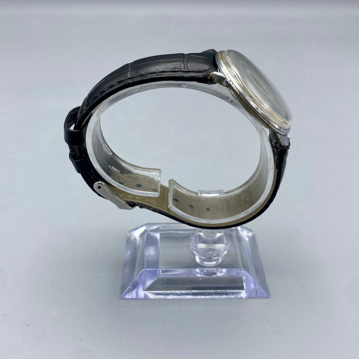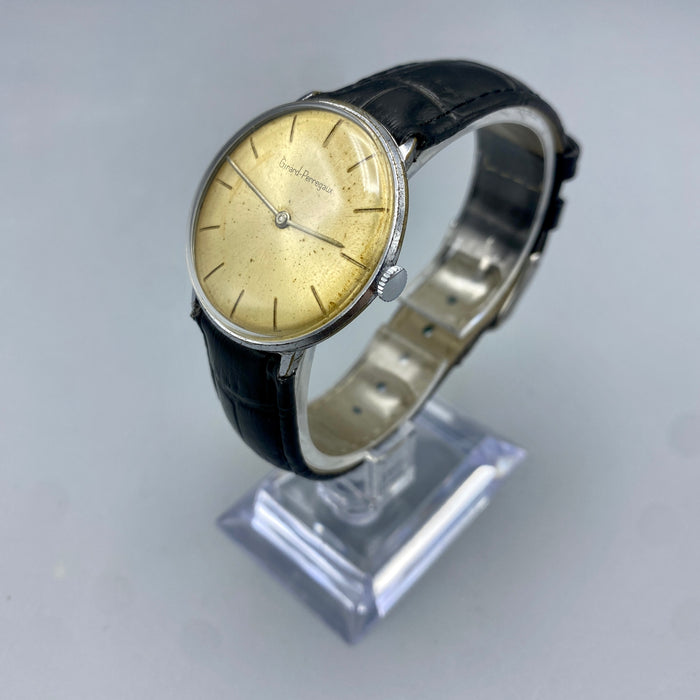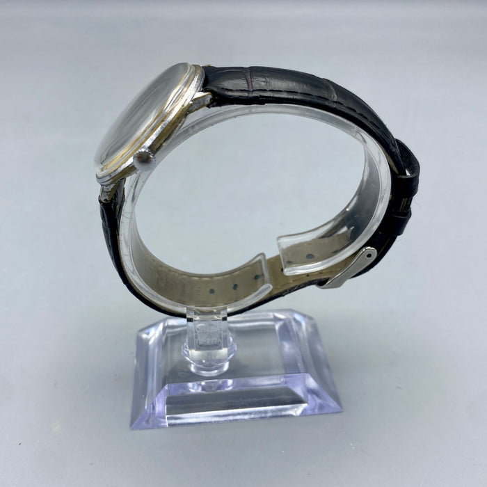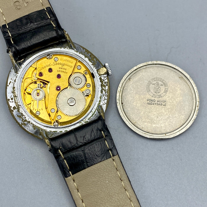 Orologio solo tempo marca Girard Perregaux, movimento carica manuale. Movimento revisionato, cassa cromata con segni del tempo sul retro cassa visibili in foto. Corona non loggata, cinturino in pelle nera sostituito recentemente.