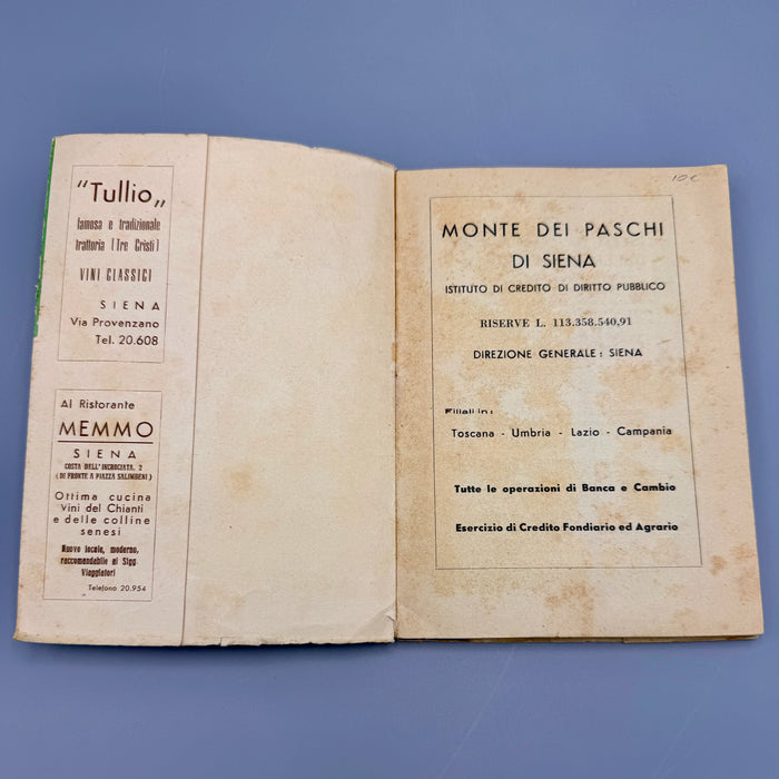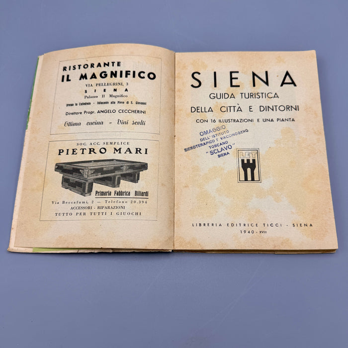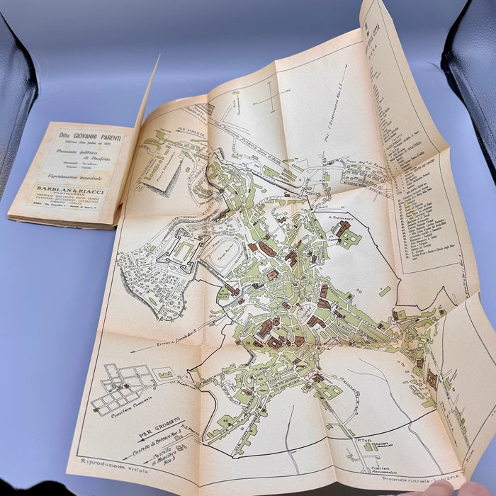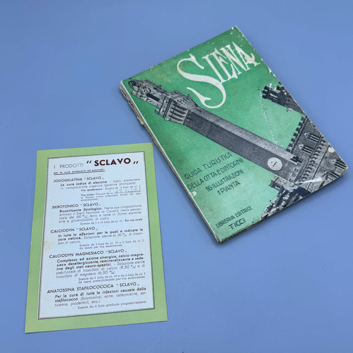 Libro "Siena Guida Turistica" del 1940 omaggio della Sclavo, con inserto pubblicitario dell'azienda farmaceutica. Completo di mappa.
