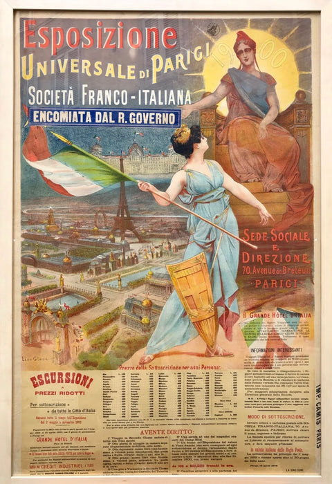 Originale manifesto della Expo di Parigi del 1900, restaurato su carta da manifesti, stampato dalla Imp. Camis di Parigi ed illustrato da Leon Glaize. Montato da noi in cornice di tiglio, senza vetro. Presente bollo di affissione.