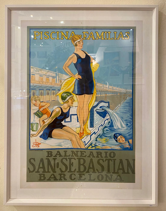Originale manifesto pubblicitario turistico Piscina Familias Balneario San Sebastian Barcelona, illustratore a noi non noto, stampato dalla Thomas di Barcelona. Pezzo da collezione originale degli anni 20/30, carta già applicata su tela e da noi incorniciato. Costi di spedizione da concordare, il manifesto può anche essere spedito senza cornice. Ci scusiamo per gli inevitabili riflessi del vetro nella foto.