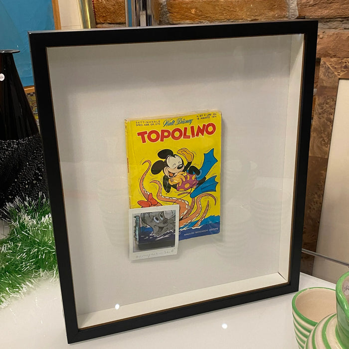 Originale Polaroid scattata e firmata dal Maestro Maurizio Galimberti, a completare l’immagine di copertina del fumetto Topolino. Opera corredata di sua certificazione ed incorniciata, il costo di spedizione è da intendersi cornice inclusa.