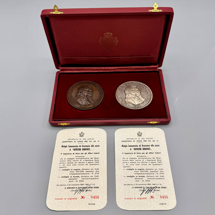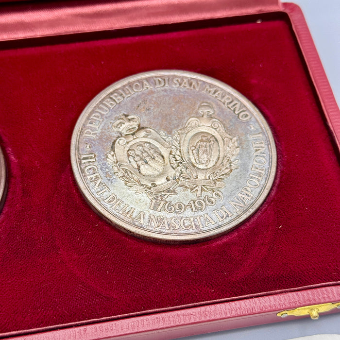 Medaglie commemorative Bicentenario Napoleone Bonaparte San Marino bronzo argento 1969