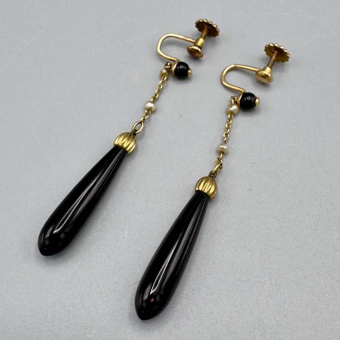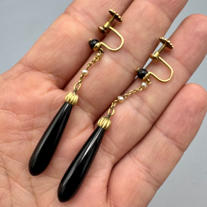 Coppia di orecchini montatura in oro 18kt, piccole perle a decoro della catena e pendenti in onice lavorato a goccia. Con scatola d'epoca.