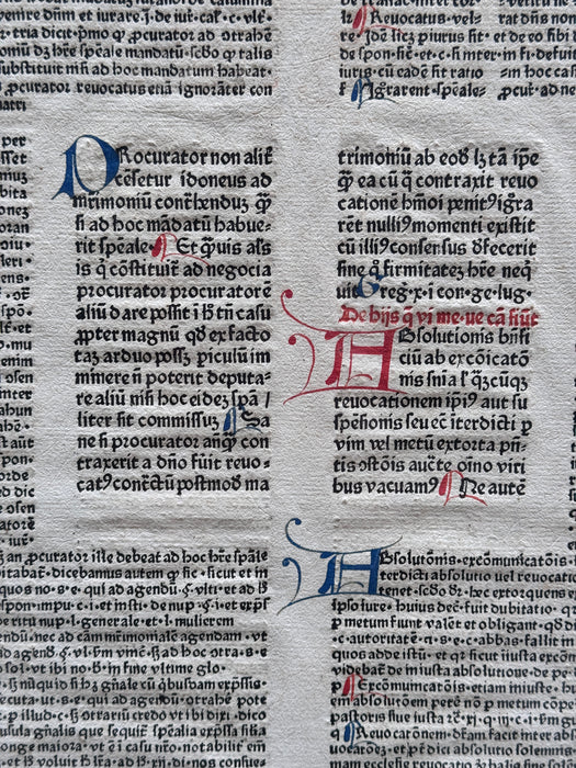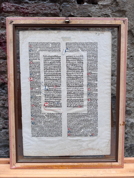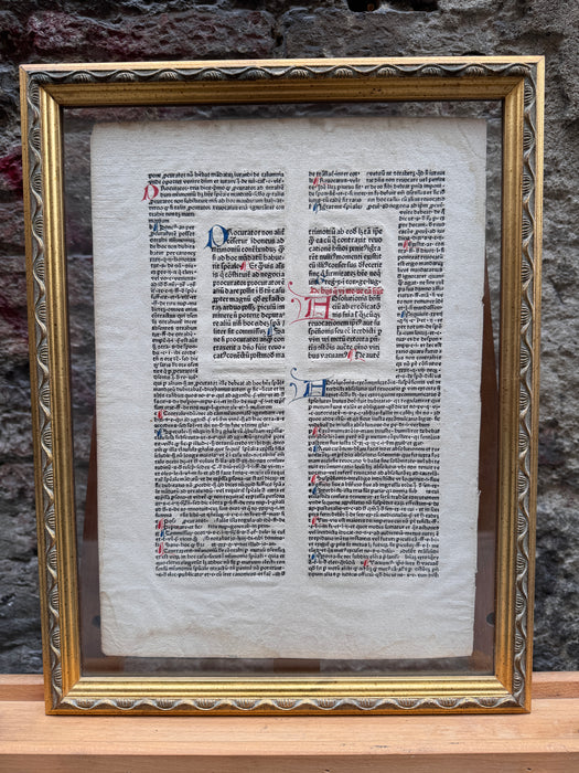 Interessante pagina di diritto ecclesiastico, realizzata su carta vergata e capilettera decorati, databile tra il '500 ed il '600. In cornice con doppio vetro come da ritrovamento.
