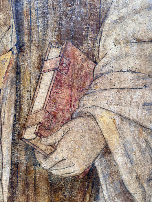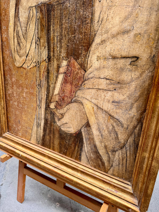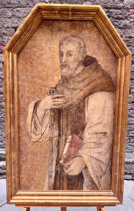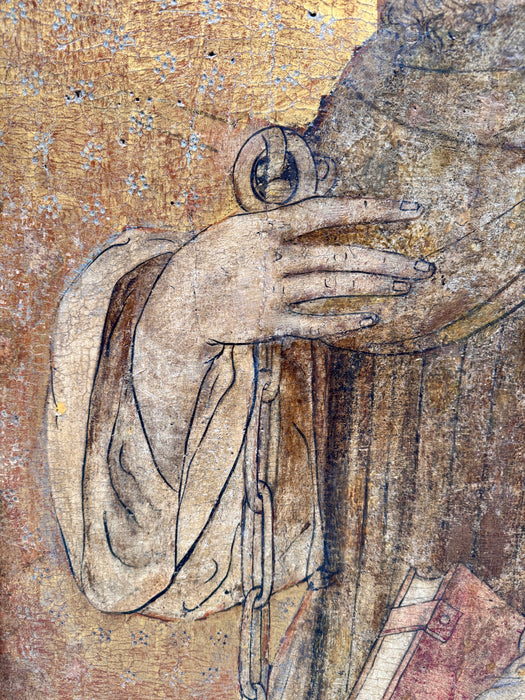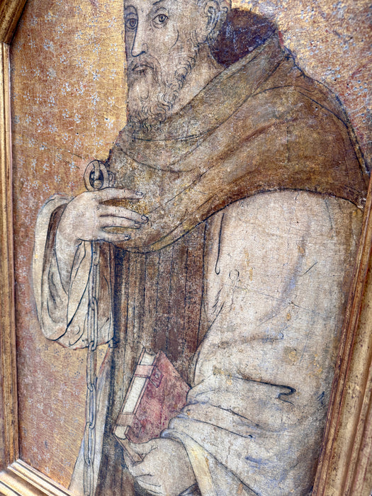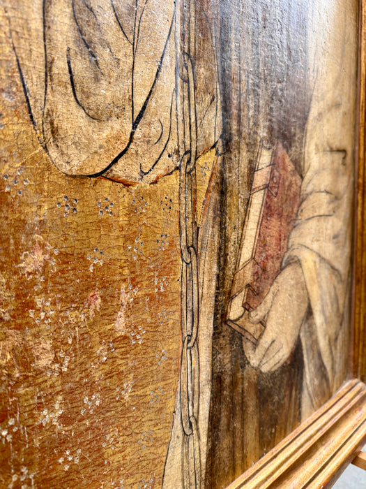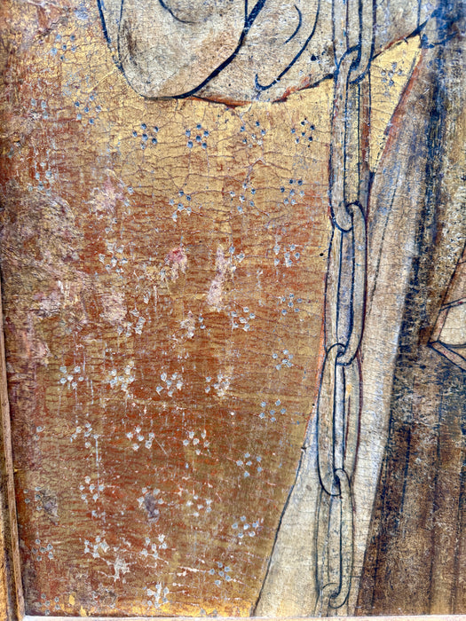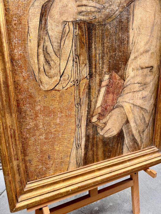 Importante opera realizzata con la tecnica del fondo oro su tavola, soggetto "San Leonardo" protettore delle carceri. Opera di influenza Spagnola, provenienza Italiana. Cornice ed ingabbiatura sul retro realizzate negli anni 80.