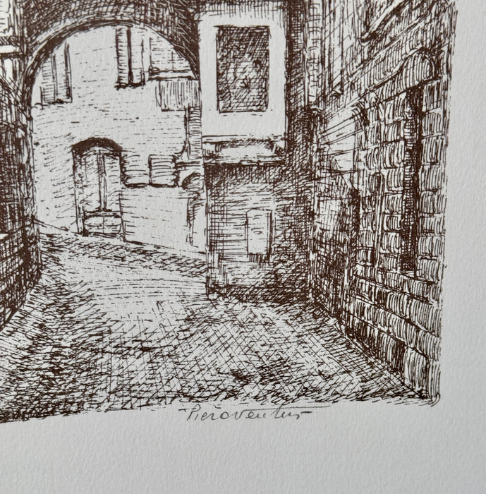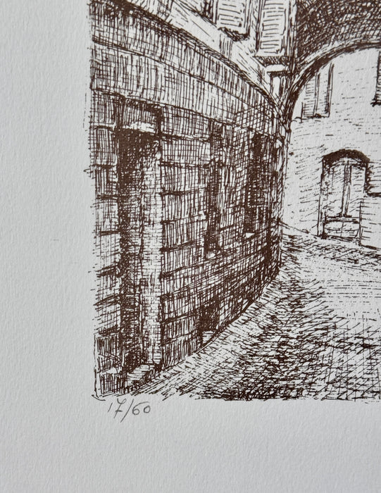 Litografia su carta titolo "Stalloreggi Siena" realizzata da Piero Venturi a cura del Centro delle Arti di Siena e della Libreria Senese, edizioni "Lito 3". Numerazione 17/60.