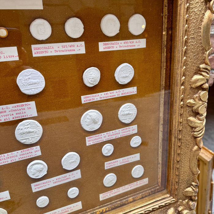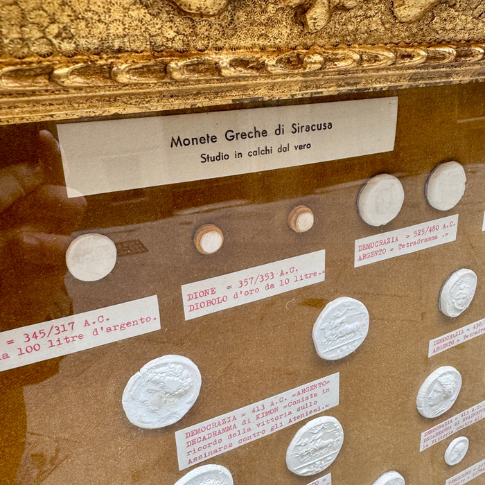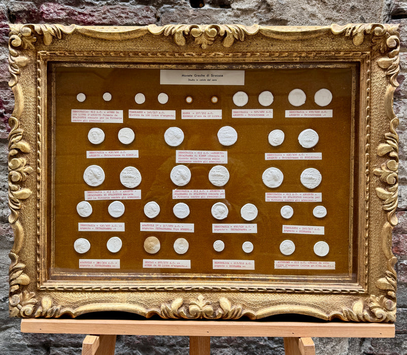 Interessante quadro composto dai calchi in gesso delle monete Greche di Siracusa, studio dal vero. In cornice come da ritrovamento.
