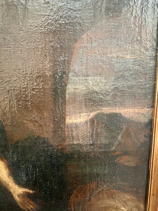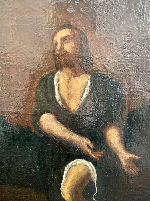 Olio su tela raffigurante San Rocco Confessore nella posa arcaica che indica la ferita nell'inguine. Opera del seicento, realizzata nel Nord Italia, probabile Liguria. Restaurato alcuni decenni fa, cornice non coeva, moderna in stile.