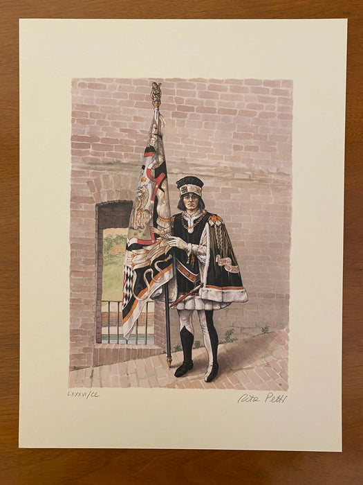 Litografia numerata tiratura 150 esemplari, firmata di pugno da Rita Petti. Stampata da La Nuova Lito di Firenze su opera originale dell’artista, Paggio Maggiore della Contrada della Lupa. Costume progettato da Pier Luigi Olla, scorcio di Via di Fonte Nuova.