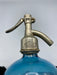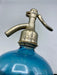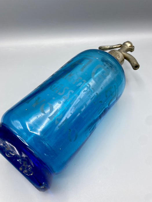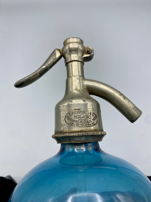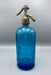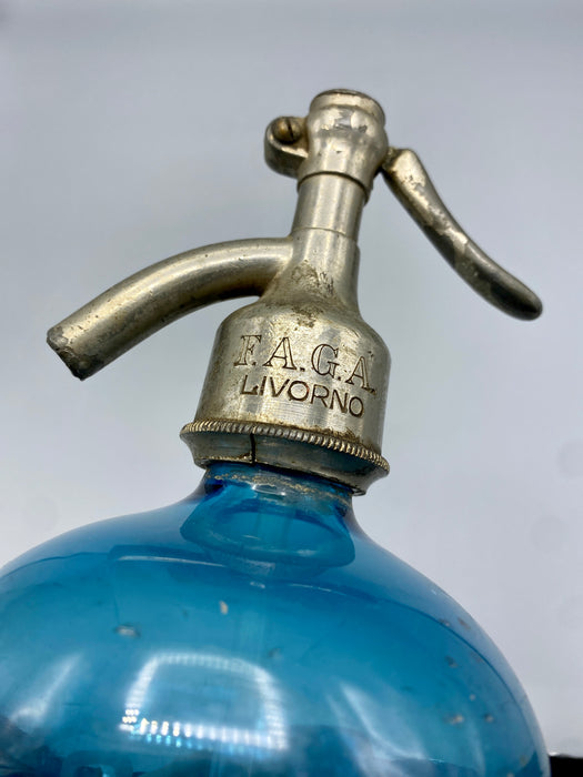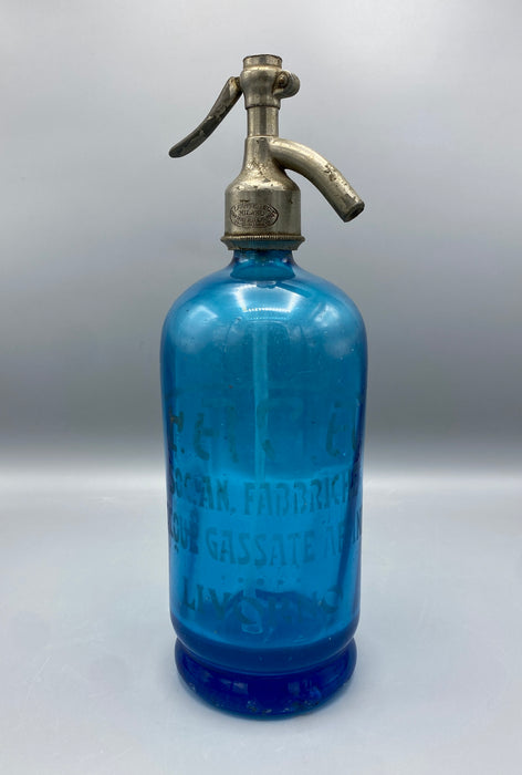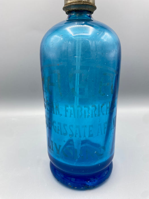 Bottiglia da Seltz soda marca Fage di Livorno, vetro blu serigrafato e tappo personalizzato. Non testato.