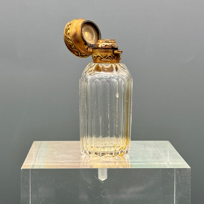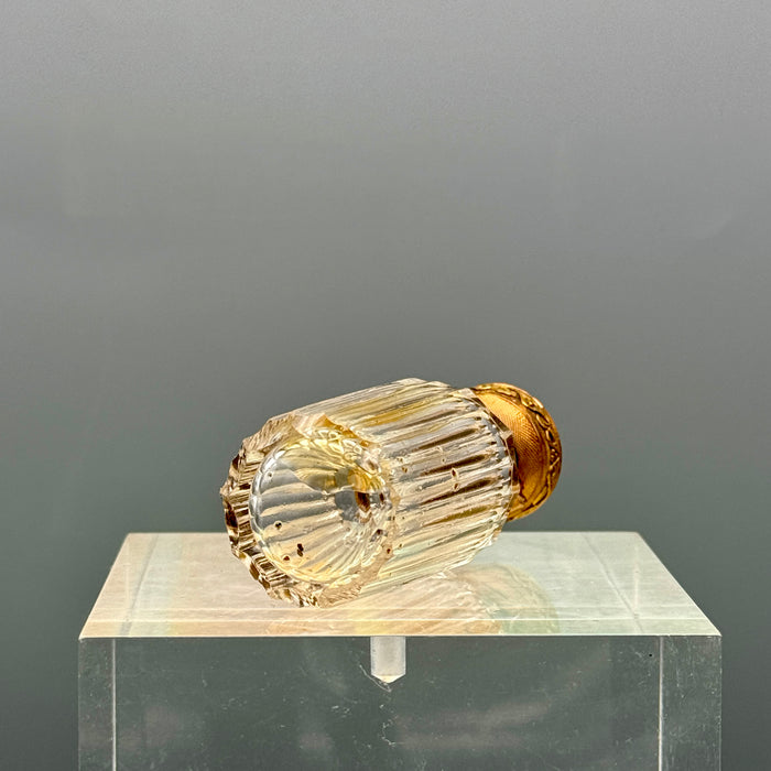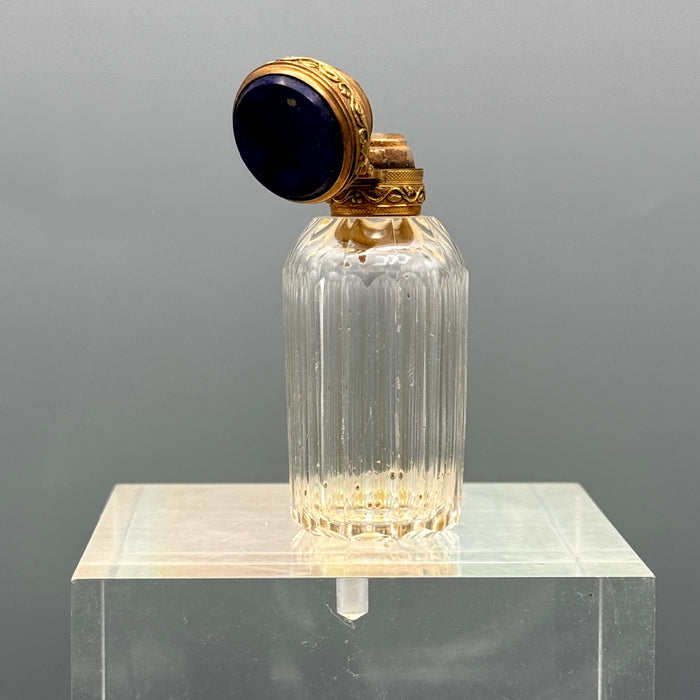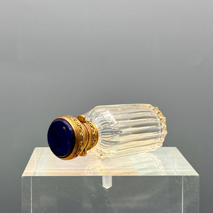 Bottiglia snuff bottle da profumo / polveri in vetro, tappo placcato oro sormontato da lapislazzulo.