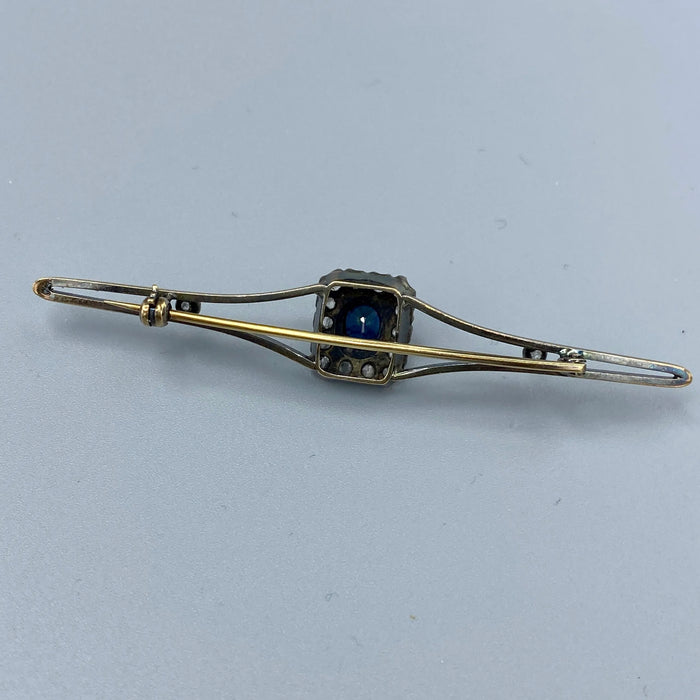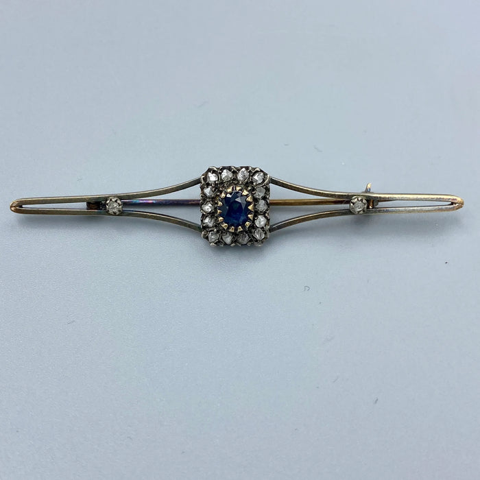 Spilla in argento con corindone naturale (zaffiro) di 0,3 ct circa (trattamento termico) e 16 diamanti naturali taglio grezzo rotondo per un peso totale stimato in 0,1 ct.