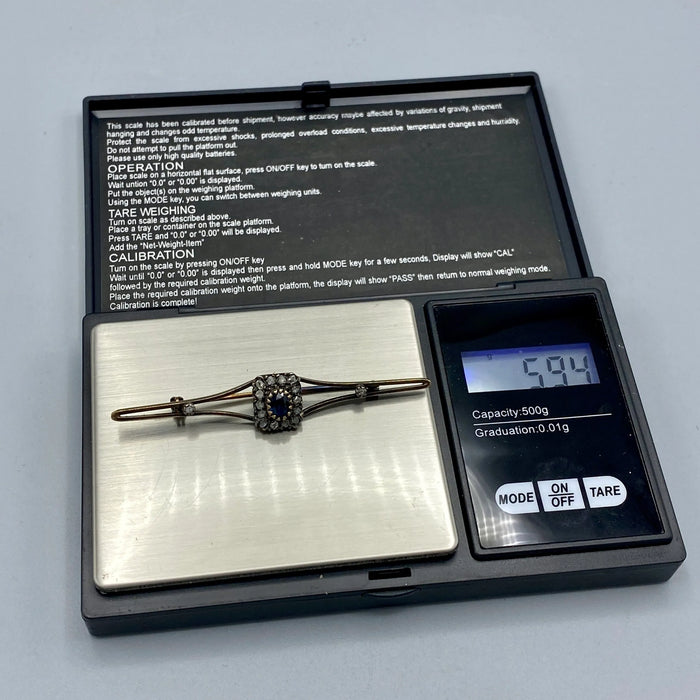 Spilla in argento con zaffiro centrale e diamanti Italia 1950 ca