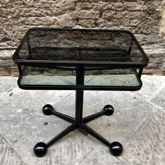 Tavolino di design carrello con ruote realizzato dalla ditta Allegri di Parma, anni settanta. Doppio piano, vetro superiore serigrafato Allegri.