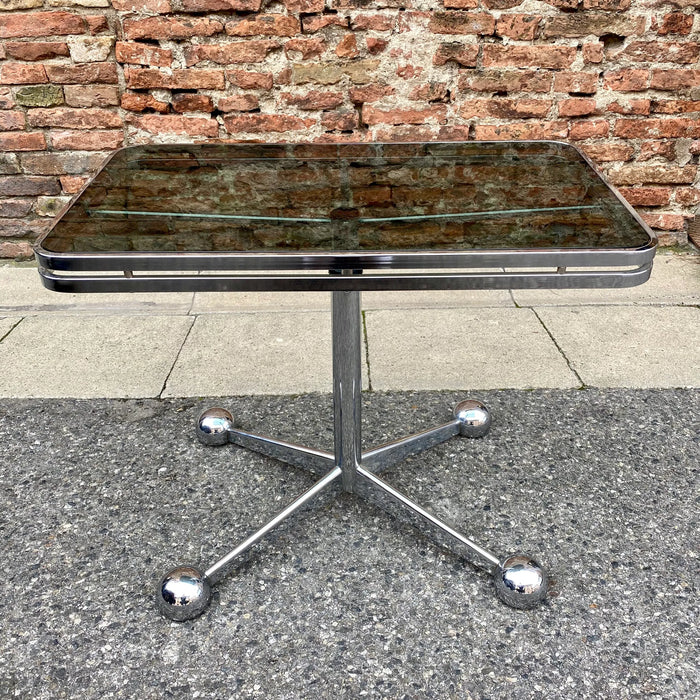 Tavolino anni settanta in struttura cromo e vetro fumè prodotto negli anni settanta dalla Allegri di Parma. Ottime condizioni generali, ruote oliate e perfettamente funzionanti.